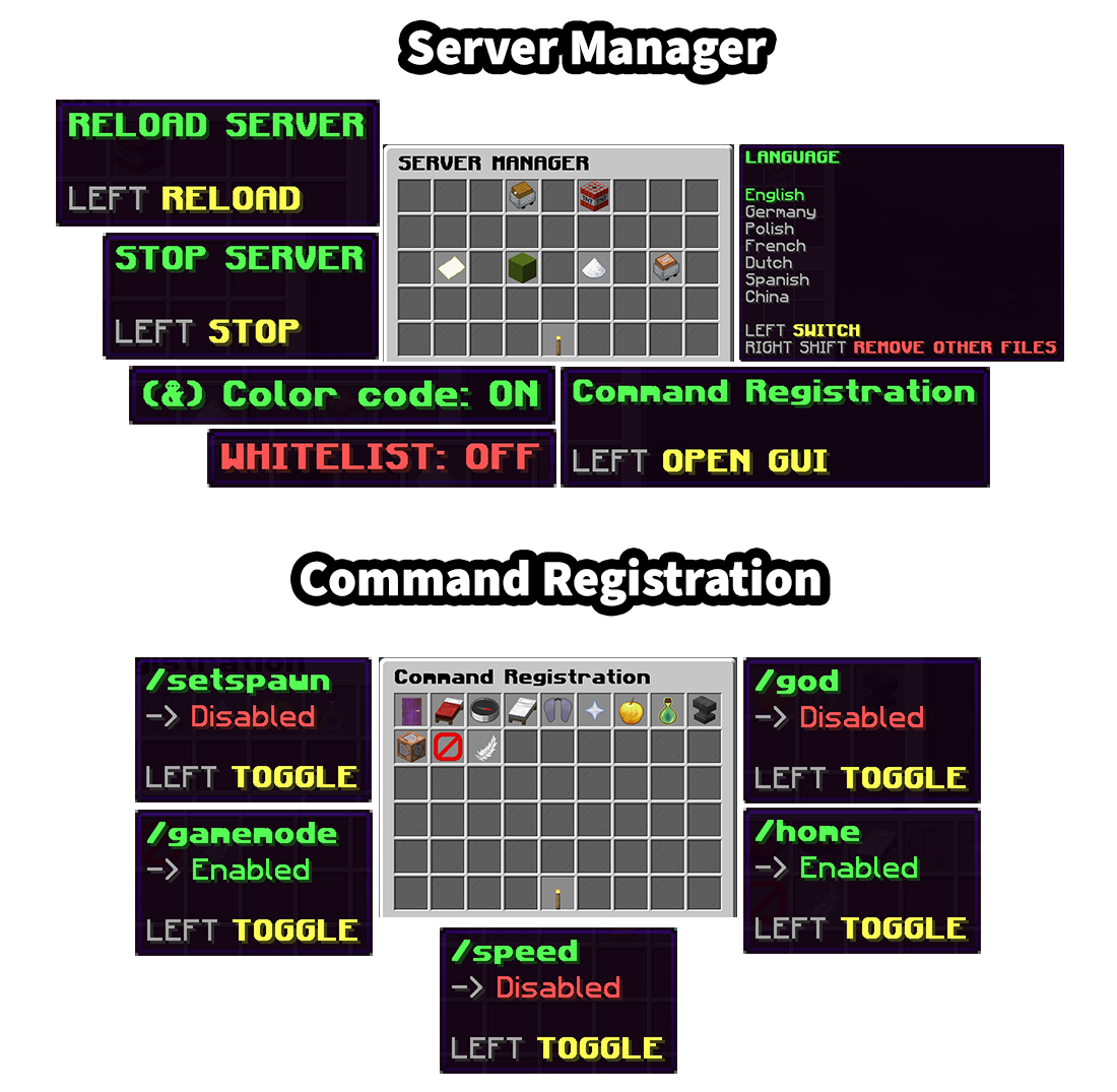 - โ๏ธ Command Registration GUI - Easily manage and toggle server commands. Through the Command Registration GUI, administrators can enable or disable commonly used commands like