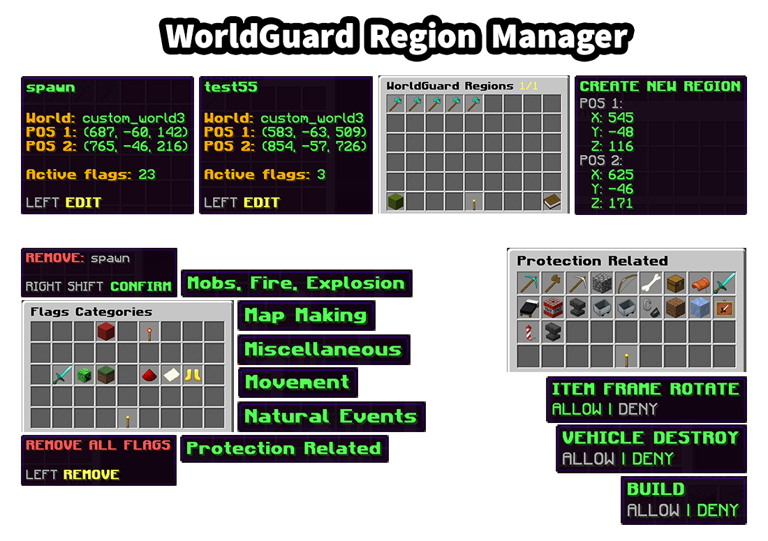 - ๐ฐ Comprehensive Flag Management - Simplified control over a wide range of WorldGuard flags. The system offers intuitive GUIs for managing various flag categories, such as map-making, natural events, mob behavior, and general protection settings. This makes it easy to customize region behaviors without needing complex commands.